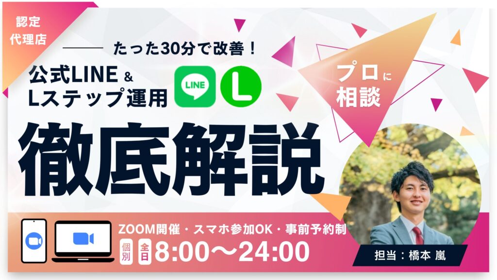 Lステップ認定代理店(旧:認定コンサルタント)として多数の構築・運用を支援してきたプロが、あなたのアカウントを一緒に見ながら改善ポイントをその場で提案します。